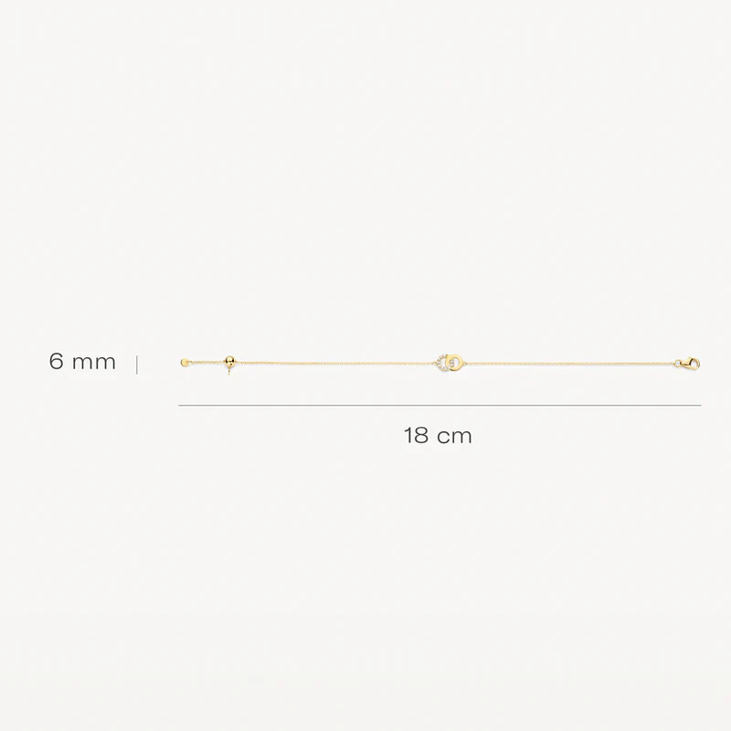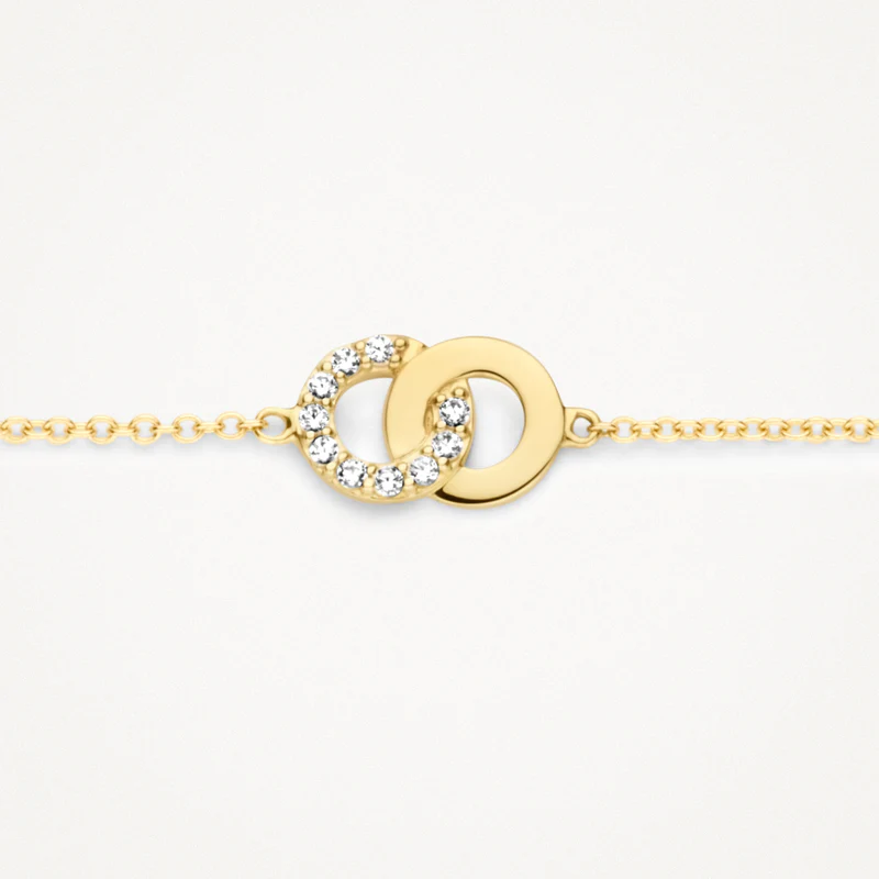 Deze elegante 14k geelgouden armband wordt gesierd door twee in elkaar grijpende ringen waarvan er een is bezet met zirkonia’s. De totale lengte is 18 cm en de armband heeft een karabijnsluiting. Een schitterend cadeau aan jezelf of om de band met een ander te bevestigen.