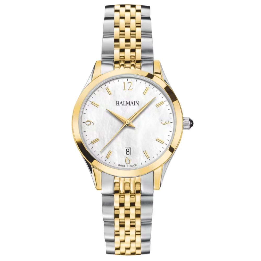 De Balmain Classic R is een verfijnd dameshorloge dat elegantie combineert met een modern ontwerp geïnspireerd door de Parijse Haute Couture. De witte parelmoeren wijzerplaat, versierd met diamanten en klassieke Romeinse indexen, voegt een zelfverzekerde, artistieke touch toe, terwijl de 34 mm bicolor roestvrijstalen en geelgouden PVD kast met zijn sierlijke 6,8 mm profiel en bijpassende armband dagelijkse verfijning biedt. Dit Zwitserse uurwerk is voorzien van saffierglas.