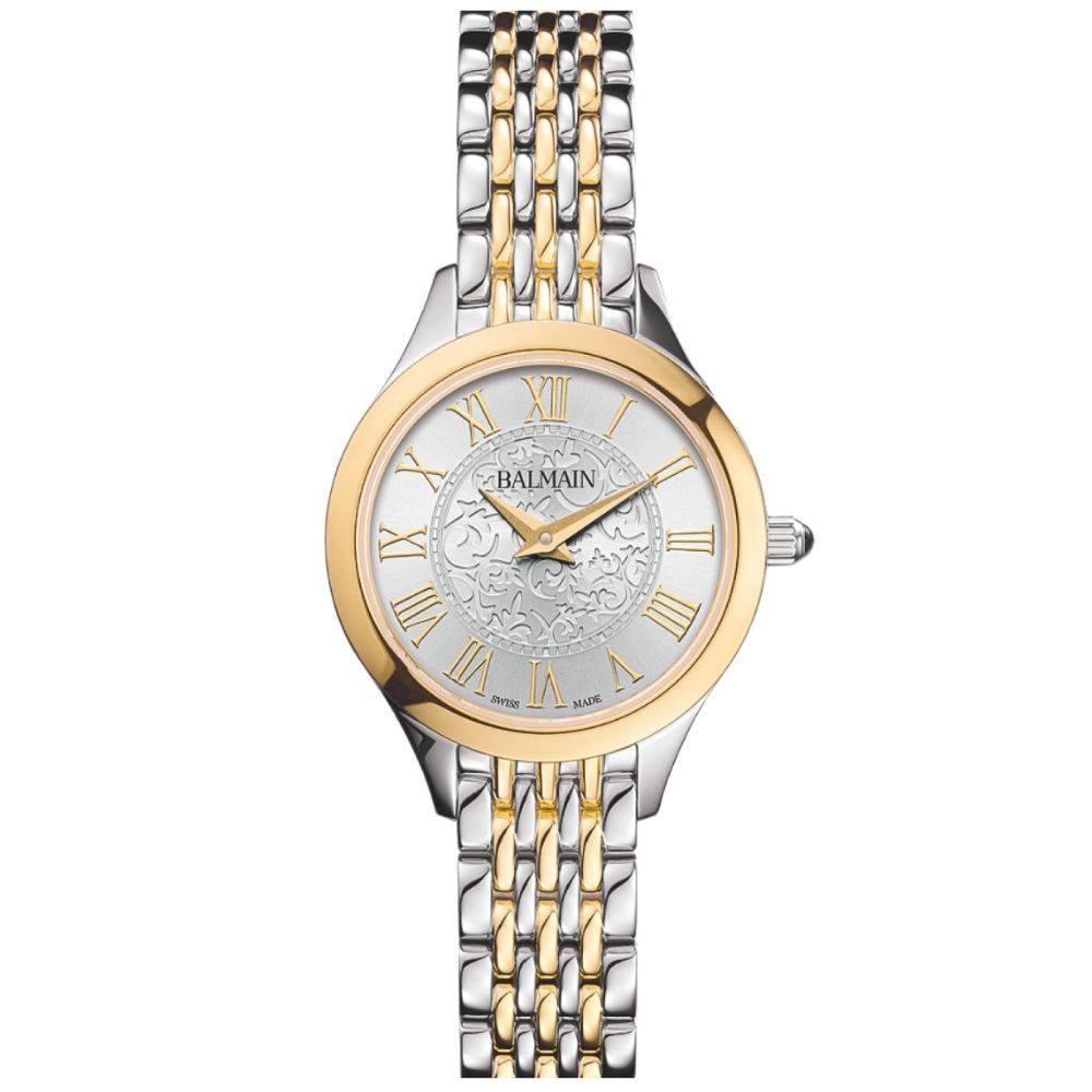 De Balmain de Balmain is een elegant dameshorloge dat gedurfde verfijning combineert met een modern ontwerp geïnspireerd op de Parijse Haute Couture. De zilverkleurige arabesken wijzerplaat en klassieke Romeinse indexen voegen een vrouwelijke, sierlijke touch toe, terwijl de 25 mm tweekleurige roestvrijstalen en geelgouden PVD kast, met een slank 5,5 mm profiel en bijpassende armband, dagelijkse verfijning biedt. Dit horloge van Zwitserse makelij is voorzien van saffierglas.