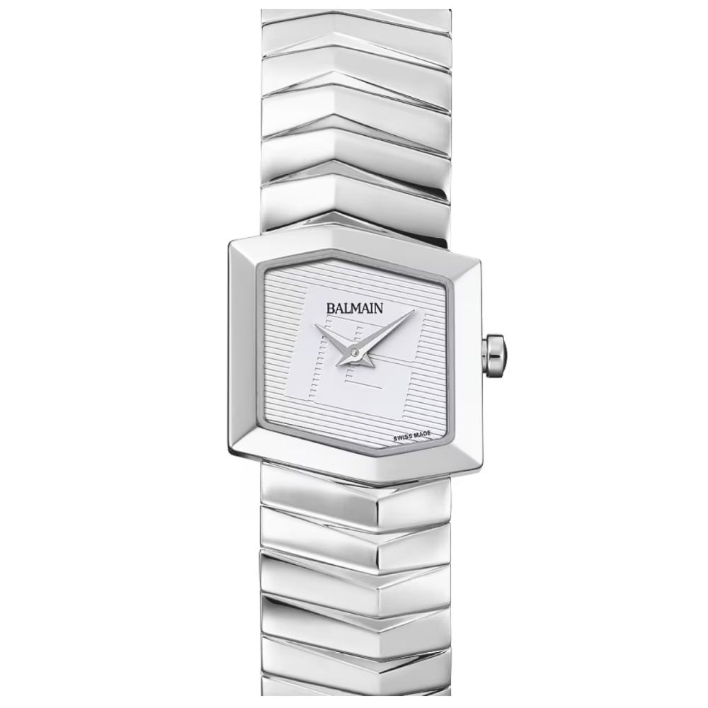 De Balmain Taffetas is een door juwelen geïnspireerd dameshorloge dat asymmetrische elegantie combineert met moderne charme. De zeshoekige kast en bijpassende armband van roestvrij staal weerspiegelen de verfijnde schoonheid van zijde, terwijl de witte wijzerplaat, subtiel gesigneerd met het Balmain-logo, een verfijnd accent toevoegt. Met een diameter van 22,50 mm is dit Swiss Made horloge voorzien van een saffierglas.
