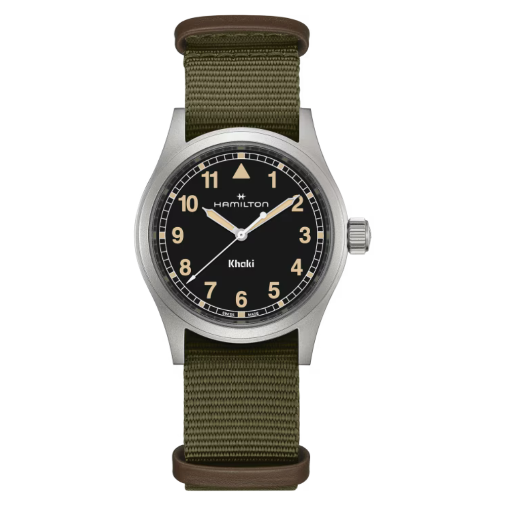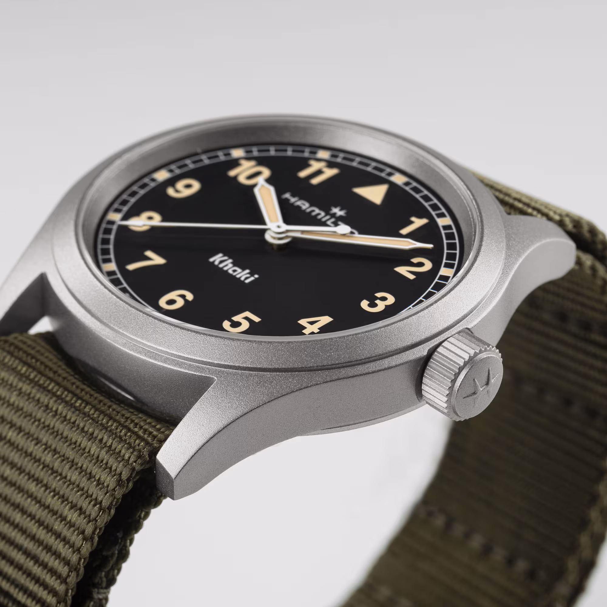De Khaki Field Quartz geeft uitdrukking aan een terugkeer naar Hamiltons militaire erfgoed via eenvoud in het design. De wijzerplaat is voorzien van een heldere typografie, met rechtere Arabische cijfers en een minutenring met spoormotief. Het kleurenpalet is ingetogen, met een slanke zwarte wijzerplaat die geaccentueerd wordt door uurmarkeringen van Super-LumiNova® in de kleur oud radium. Het horloge wordt gecombineerd met een NATO-band van groen textiel en lussen van bruin leer – perfect voor uw volgende avontuur in het veld.