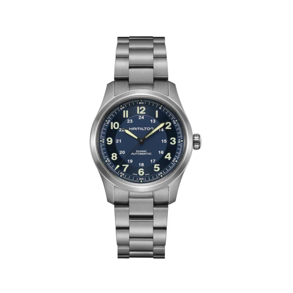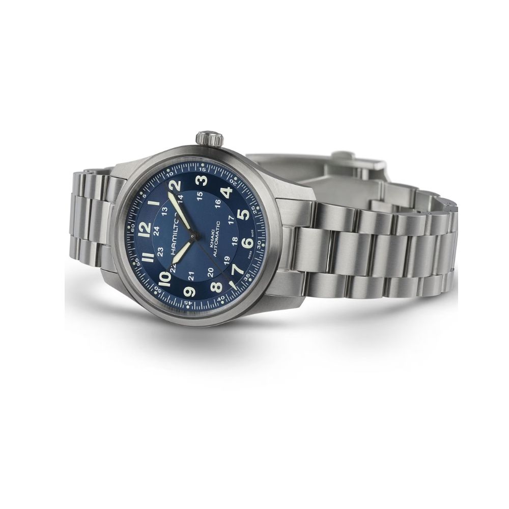 Met een titanium kast en band is de 38mm Khaki Field Titanium een zeer veelzijdig horloge dat u bij elke gelegenheid om de pols doet. Met de blauwe wijzerplaat en optimale leesbaarheid houdt u de tijd bij tijdens elk avontuur. De band heeft een geborstelde afwerking die robuustheid en karakter geeft aan het militaire design. De Khaki Field Titanium combineert lichtgewicht functionaliteit met militaire stijl en is uw betrouwbare compagnon als u op zoek bent naar nieuwe ervaringen.