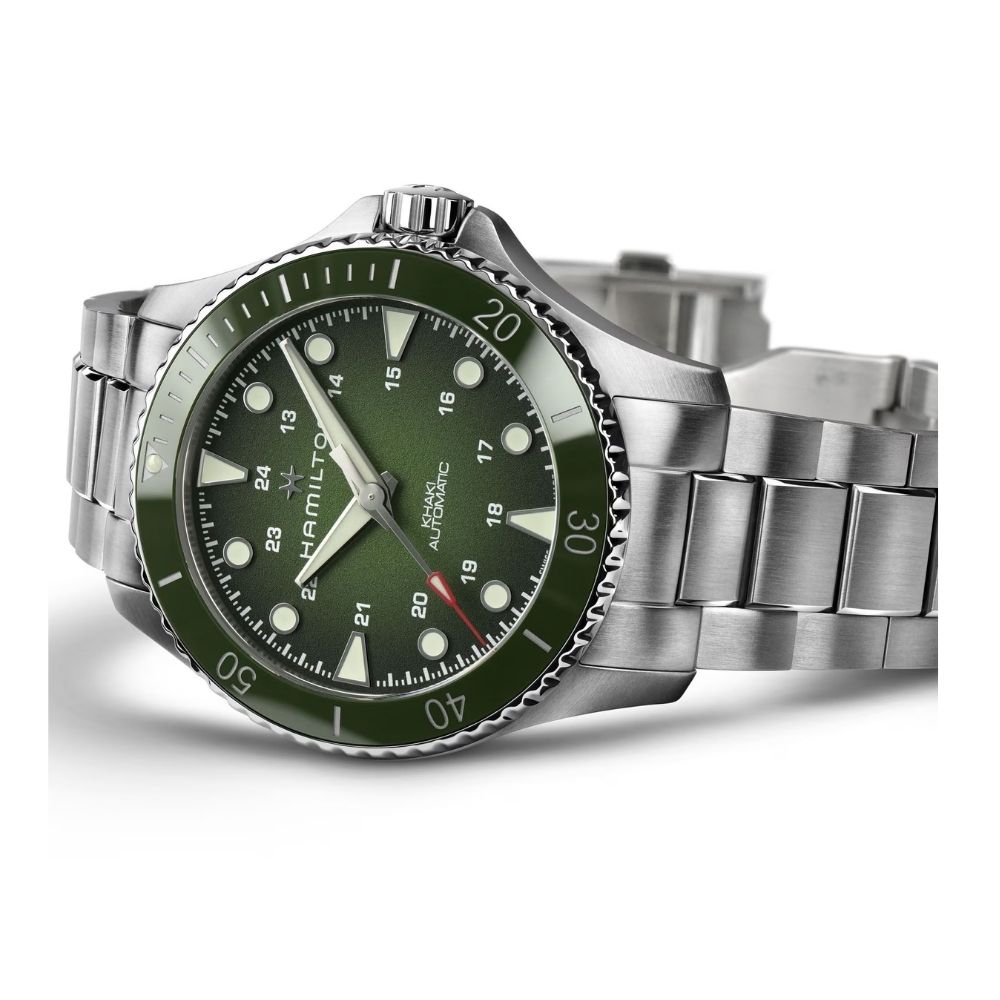 De Hamilton Khaki Navy Scuba Automatic met groene wijzerplaat is een sportief duikhorloge dat functionaliteit combineert met een opvallende stijl, geïnspireerd door maritieme pioniers.