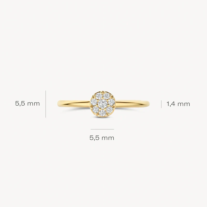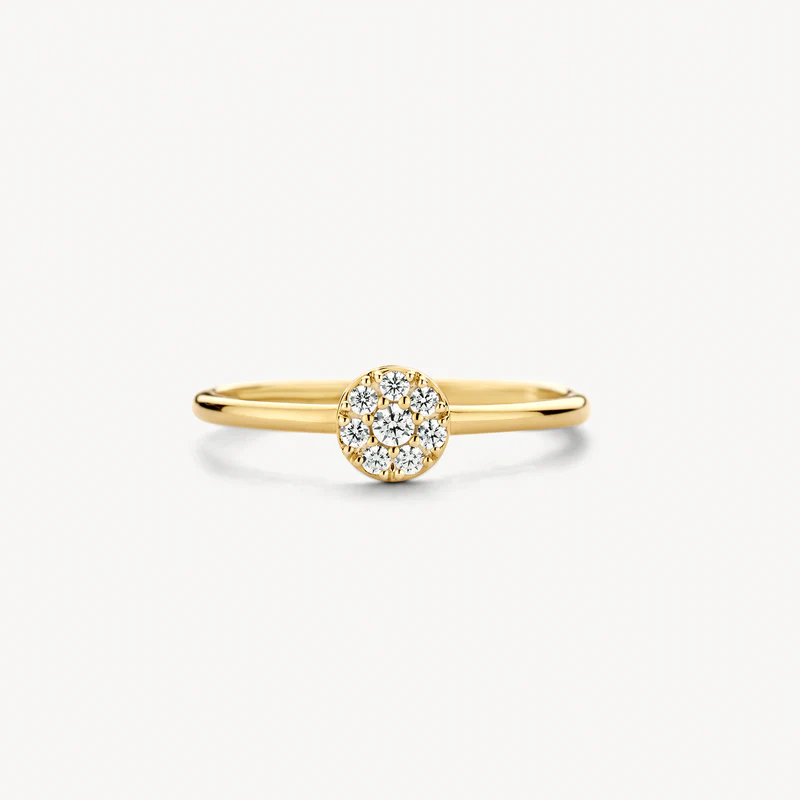 Ontdek deze verfijnde ring, vervaardigd uit 14k geelgoud. Je ziet een slanke band die subtiel overgaat in een cirkelvormig cluster van schitterende zirkonia’s. Deze zijn zorgvuldig pavé gezet voor maximale glans. Met een banddikte van ⌀ 1.4 mm draagt hij comfortabel en elegant. Een tijdloze toevoeging aan jouw sieradencollectie.