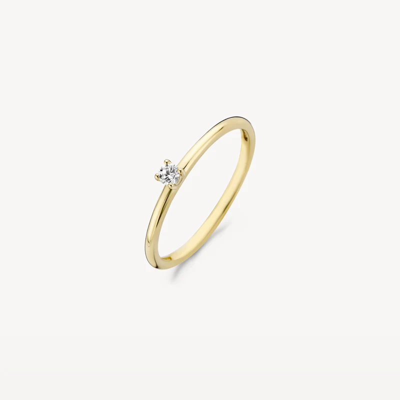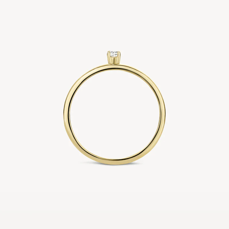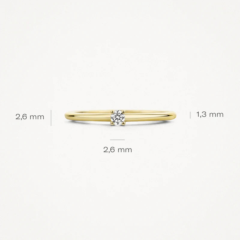 Een sprankelende zirkonia in chatonzetting siert deze stijlvolle ring van 14k geelgoud. De band is 1,3 mm breed en de steen heeft een doorsnede van 2,6 mm. Prachtig te combineren met andere ringen uit onze collectie.