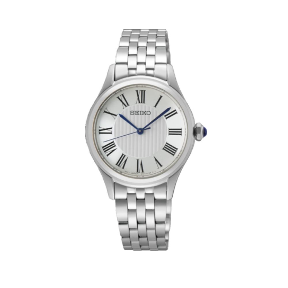 De Seiko SUR609P1 is een elegant dameshorloge met een klassieke uitstraling, voorzien van een zilverkleurige stalen kast en band, een witte wijzerplaat met Romeinse cijfers en duurzaam saffierglas.