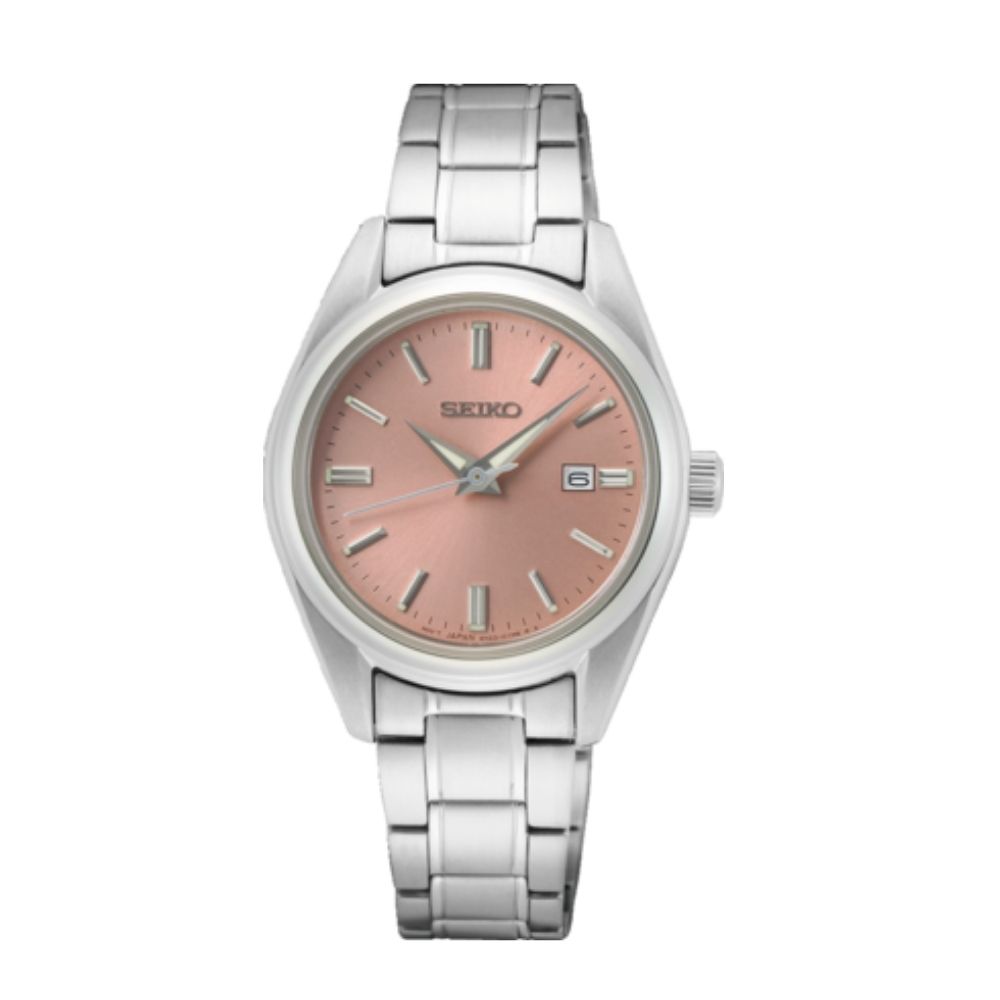De Seiko SUR529P1 is een elegant dameshorloge met een zilverkleurige roestvrijstalen kast en band, voorzien van een opvallende roze wijzerplaat en duurzaam saffierglas.