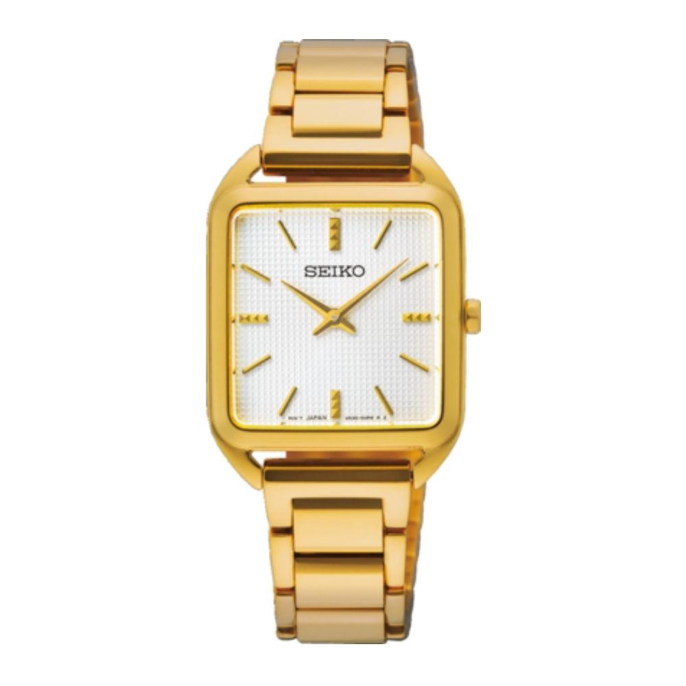 Het meest opvallende kenmerk van de SWR078P1 is de unieke tonneau-vormige (tonvormige) kast, die een zachte, gebogen elegantie biedt in tegenstelling tot de traditionele ronde of rechthoekige horloges. Zowel de kast als de geïntegreerde schakelband zijn vervaardigd uit roestvrij staal en afgewerkt met een schitterende, duurzame goudkleurige (doublé) coating.