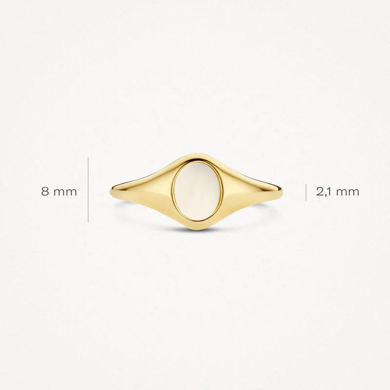 Deze tijdloze zegelring van 14k geelgoud met een parelmoeren steen heeft een simpel, glad design. De band heeft een doorsnede van 1.44 mm en de zegel een grootte van 8.4 mm bij 5.8 mm. Heel mooi op zichzelf maar ook in combinatie met andere ringen uit onze collectie.