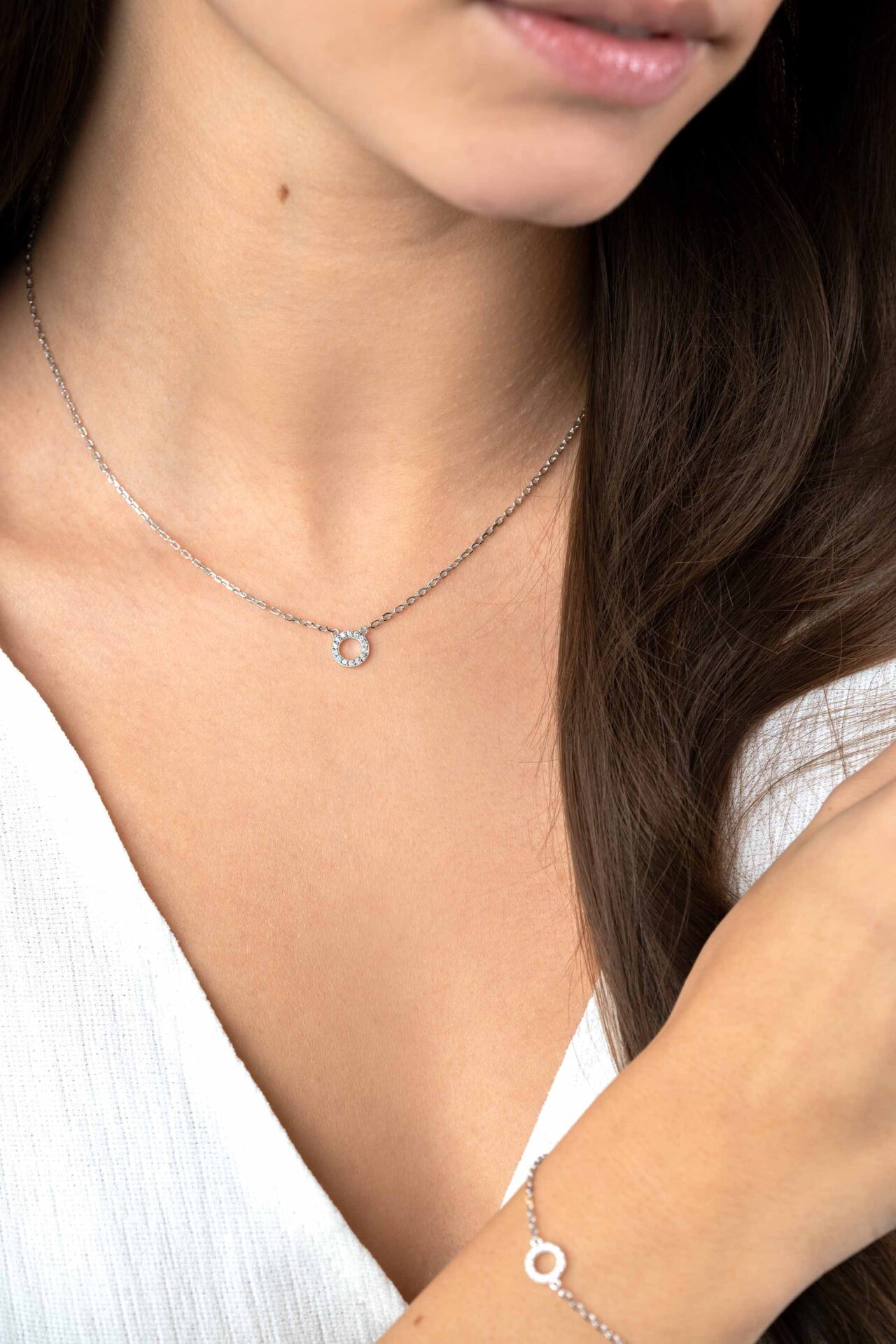 Details van Zinzi zilveren ketting met open rondje bezet met witte zirconia’s